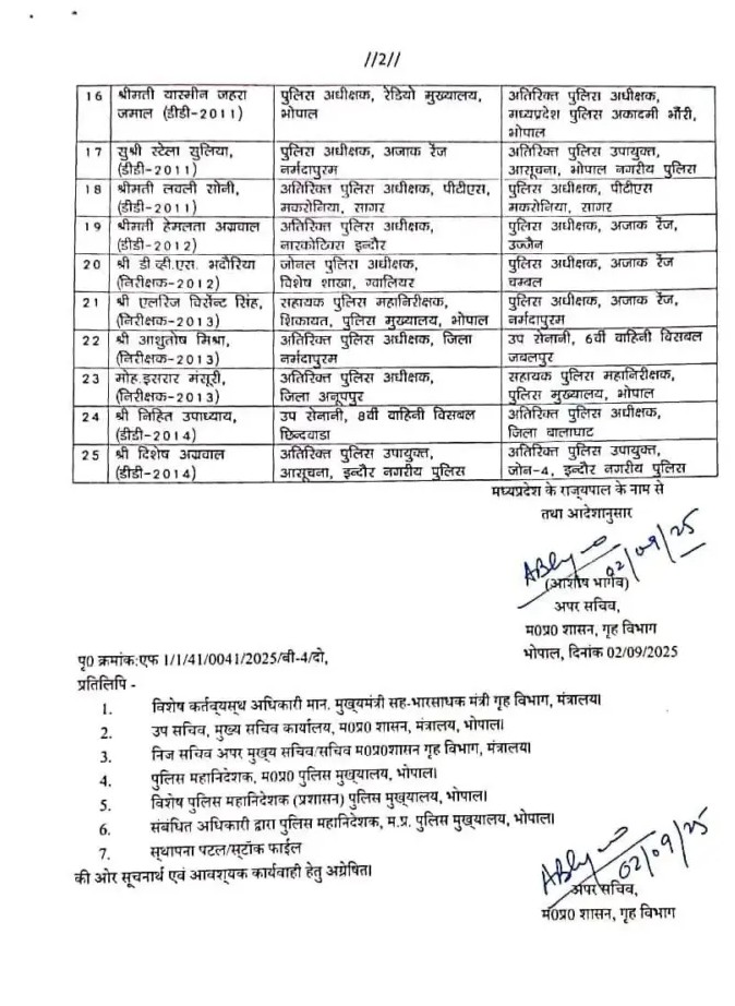 Mp police transfers : मध्य प्रदेश में देर रात फिर तबादला एक्सप्रेस दौड़ी है. मध्य प्रदेश शासन ने पुलिस विभाग के 25 अधिकारियों के ट्रांसफर कर दिए हैं. ट्रांसफर की ये लिस्ट देर रात जारी हुई है, जिसमें सभी अधिकारियों की वर्तमान पदस्थापना की साथ नवीन पदस्थापना की जानकारी दी गई है.