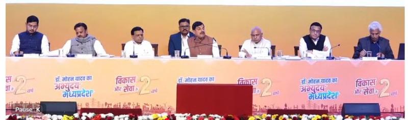 भोपाल | मध्य प्रदेश में मोहन सरकार के 2 साल पूरे होने पर आज भोपाल स्थित कुशाभाऊ कन्वेंशन सेंटर में कार्यक्रम आयोजित किया गया. इस कार्यक्रम में सीएम मोहन यादव ने प्रेस कॉन्फ्रेंस के माध्यम से सरकार के दो सालों का लेखा-जोखा जनता के सामने रखा. इस प्रेस कॉन्फ्रेंस में उपमुख्यमंत्री राजेंद्र शुक्ला, उपमुख्यमंत्री जगदीश देवड़ा और भाजपा के प्रदेश अध्यक्ष हेमंत खंडेलवाल मौजूद रहे |