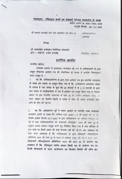 राजेश वानखेड़े ने जांच नहीं करने के लिए लगाई थी, आपत्ति। जिसे पंजीयक भोपाल ने खारिज कर 26 मार्च को सुनवाई तय की